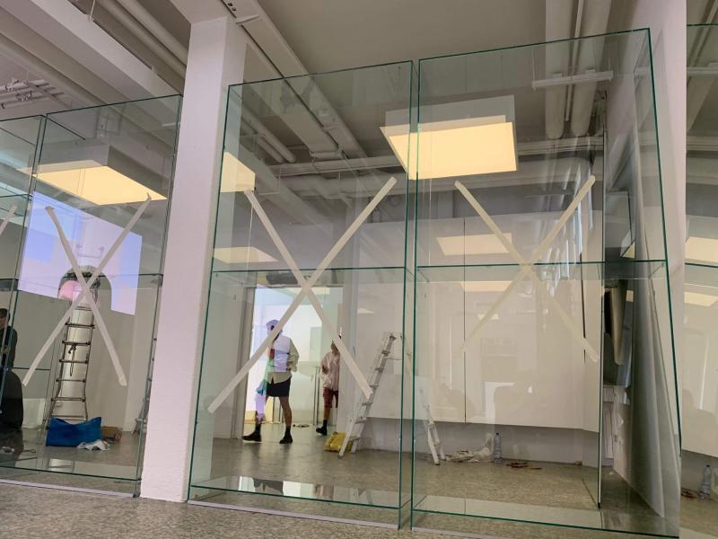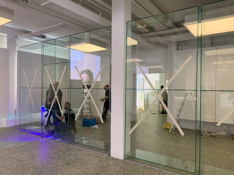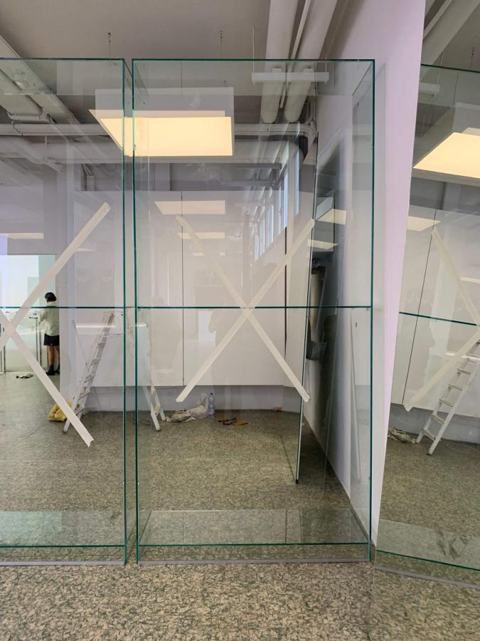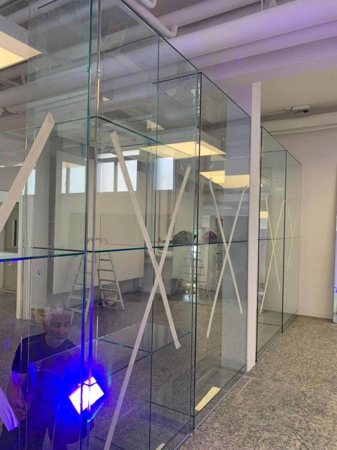 Fatto un sopralluogo nell’open space, abbiamo subito proposto come soluzione una cabina armadio in vetro alta circa 3 metri, da parete a parete, con un passaggio laterale. Questa soluzione avrebbe permesso di sfruttare la presenza delle colonne in cemento armato presenti nello showroom, inserendole come elemento nell’installazione di vetro.