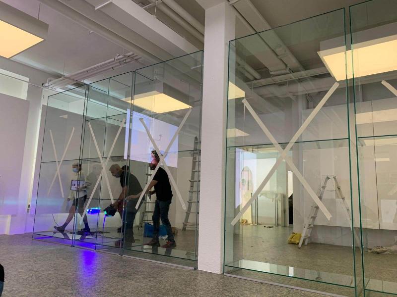 Per realizzare la vetrina in cristallo per esposizione abbiamo utilizzato delle lastre in vetro stratificato 5+5 molato, che in caso di rottura non rilascia frammenti di vetro pericolosi. Date le dimensioni considerevoli della cabina in vetro, le vetrine sono state saldate sul posto. Abbiamo alternato nicchie dove appendere gli abiti a nicchie con ripiani e abbiamo mantenuto il basamento ad un’altezza tale da rendere agevole la pulizia dell’ambiente.