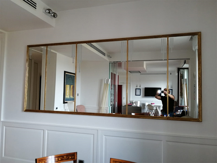 Nel nostro laboratorio di vetreria a Milano ci siamo occupati del taglio dello specchio nelle sue diverse parti, del successivo assemblaggio con la cornice e della personalizzazione con alcune decorazioni sullo specchio. Completato il lavoro siamo tornati nell’ufficio per il montaggio finale.