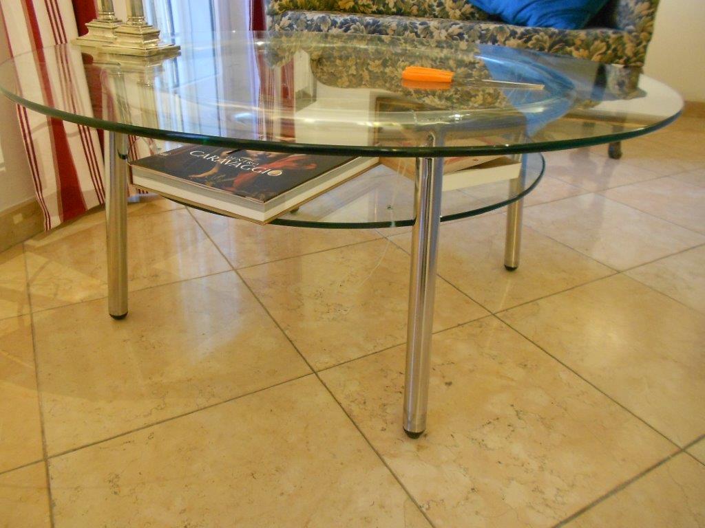 Gli usi dei piani sono molteplici, in questo caso, il primo è utilizzato in modo molto funzionale come semplice piano d’appoggio per diversi oggetti, il secondo è utilizzato come un vero e proprio portariviste, molto comodo, pratico e al tempo stesso esteticamente gradevole. Il tipo di vetro utilizzato è temperato; inoltre, il taglio effettuato è su misura e di forma circolare.